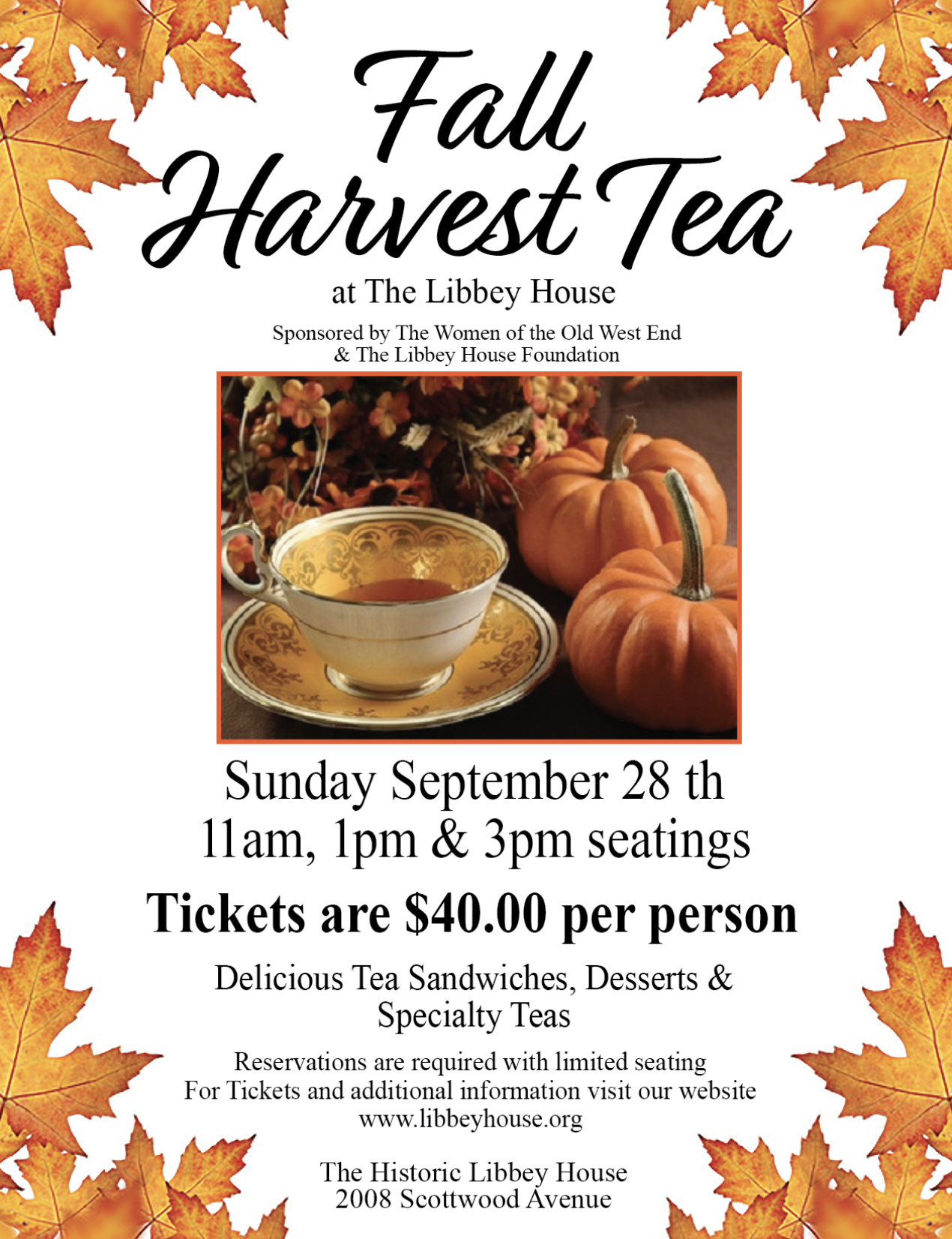 The Libbey House Foundation and Women of the Old West End will present a Harvest High Tea. There will be three 90-minute seatings available: 11:00 AM*, 1:00 PM, and 3:00 PM. Enjoy your choice of delicious tea from an assortment of teas, teasandwiches, and scrumptious desserts.